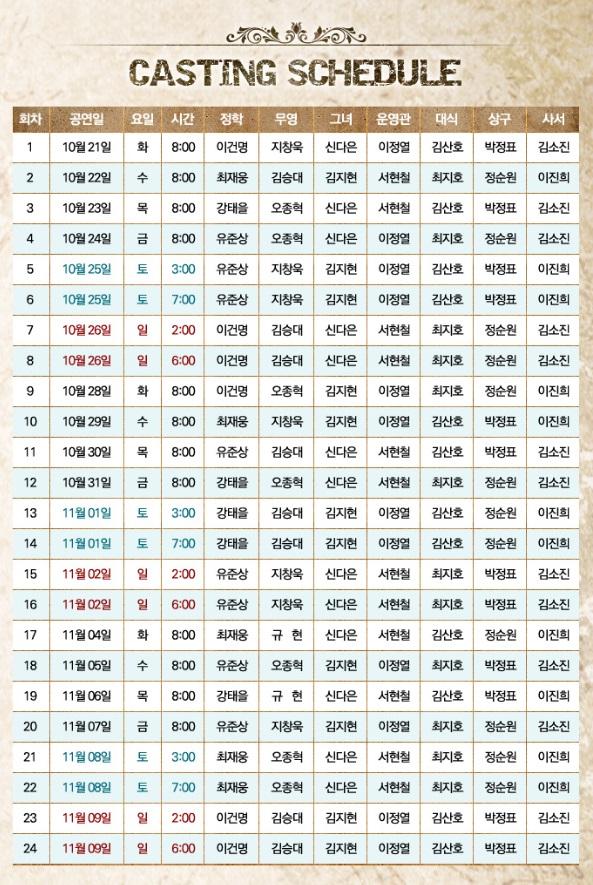 First Row: Yoo Jung Sang, Kang Tae Eul and Lee Gun Myung as Jeong-hakThe casting schedule has been released! Ji Chang Wook will be performing at the premiere on 21 October. A great honour indeed!