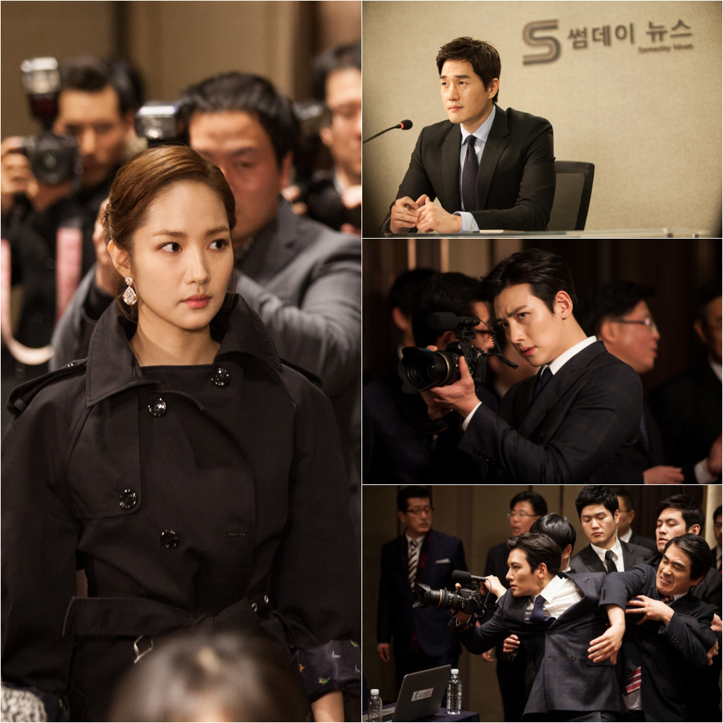 Park Min Young is seen wearing a black trench coat in front of numerous reporters, looking at somewhere with a stern expression. Dressed in a black suit, Ji Chang Wook is filming something with his camera. But Ji Chang Wook is surrounded by people trying to stop him, raising anticipation to know just how important this report is to Park Min Young and Ji Chang Wook.