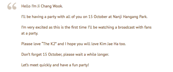 Based on the brief description on Interpark, this will be a casual fun-filled party, where fans can expect to watch the broadcast of his new drama “The K2” with Ji Chang Wook, and binge on chicken and sodas. There will also likely be some music and DJ’ing at the party! Sounds like a lot of fun!