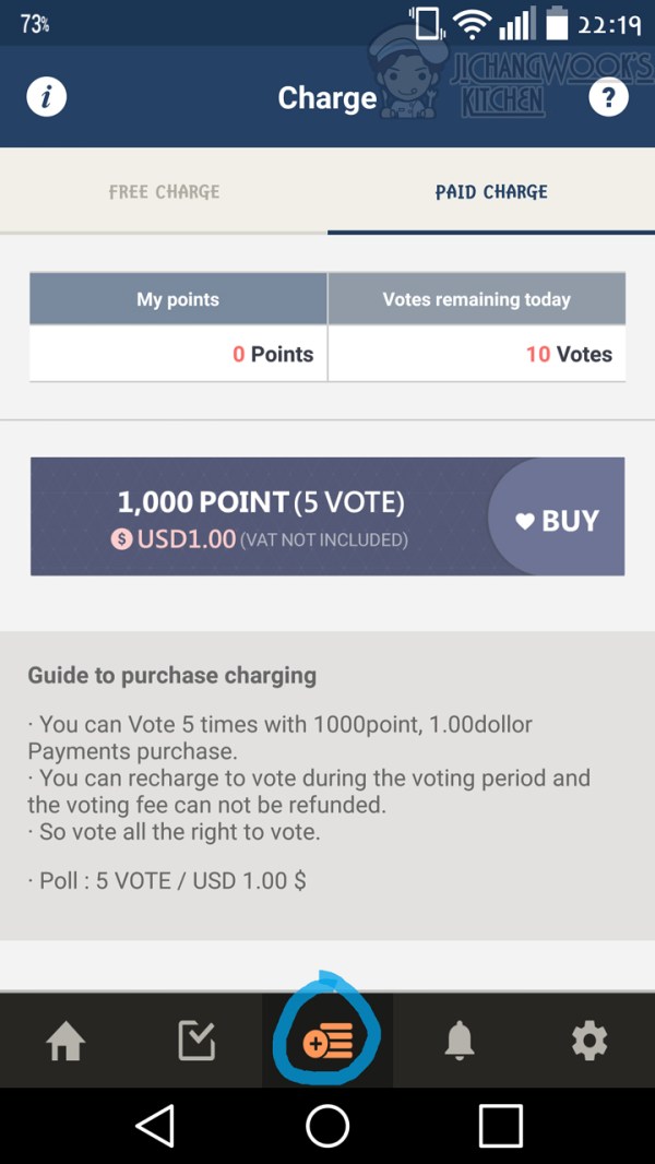 Step 7: Once your device is successfully verified, you can attempt to vote, but the app will prompt you that you do not have enough points to vote. You will need to charge your points first by selecting the middle button in the bottom menu.