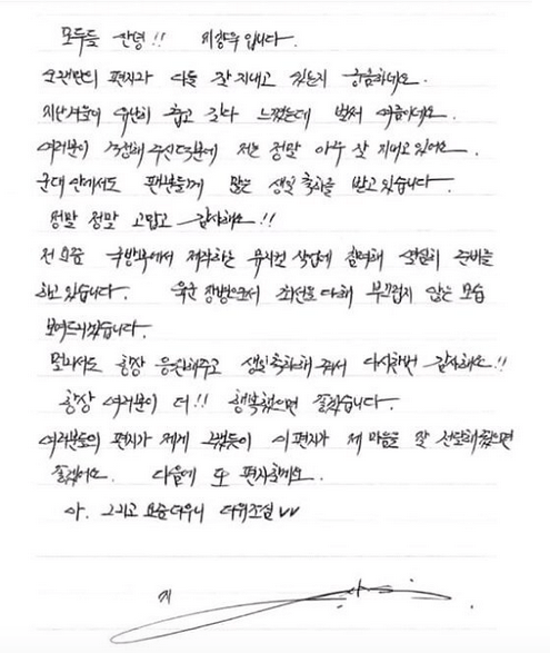 Such a sweet letter from an amazing guy. So glad to hear he is doing well and staying healthy. Can’t wait for him to get out of military. Guess I am being selfish but, anxious to see him in another drama.
