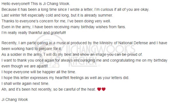 On 6 July, Corporal Ji Chang Wook set aside a few minutes from his increasingly busy schedule to pen a quick letter to all his fans through his Dayrock fan cafe. Take a look below!