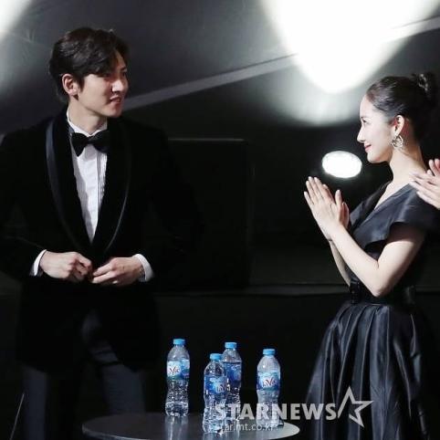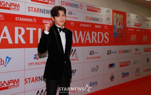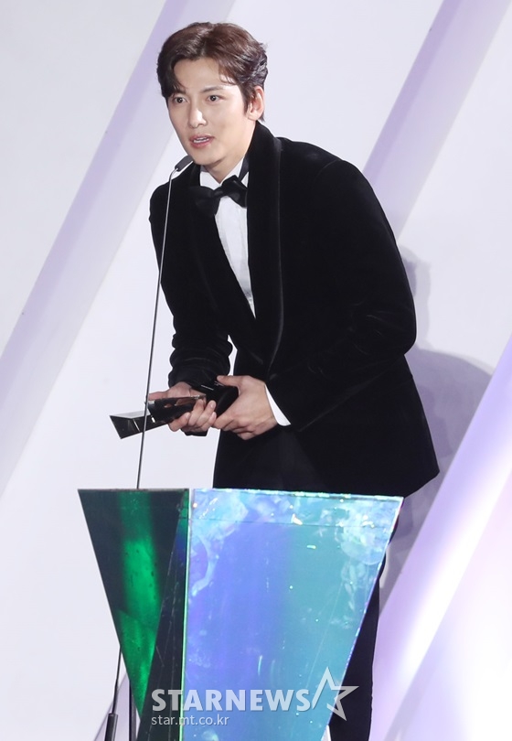 Ji Chang Wook accepted his Best Celebrity (Actor) award along with his “Healer” co-star Park Min Young, who won for Best Celebrity (Actor) as well. (The AAA went to gender-neutral pronouns with its 2018 broadcast.)